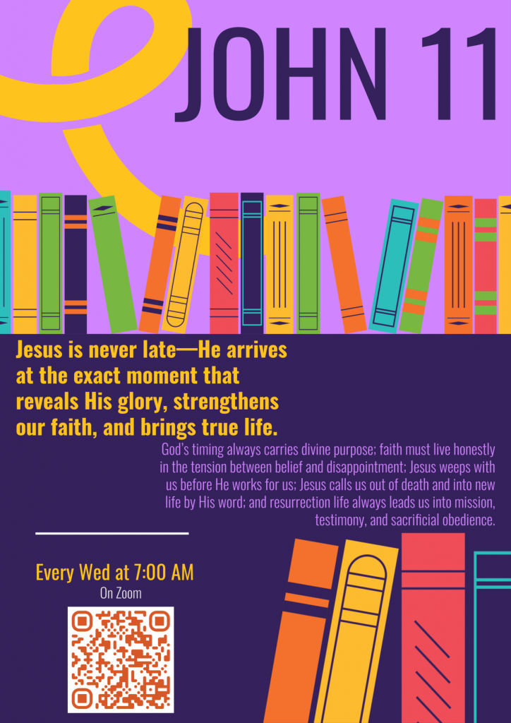 时间:每周三晚上 9:15 – 10:30; 教会 Zoom 聚会链接